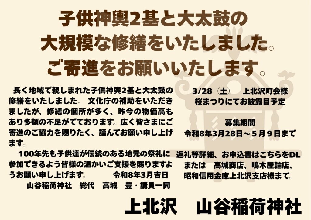 山谷稲荷神社 子供神輿・太鼓 修繕 回覧板 2026.03.31 子供神輿・太鼓 修繕 上北沢地域の子どもたちが祭礼で担ぐ子供神輿二基および太鼓一張につきまして、長年の使用により傷みが進んでいたため、このたび修繕を実施いたしました。 子供神輿・太鼓 修繕費ご寄進のお願いダウンロード
